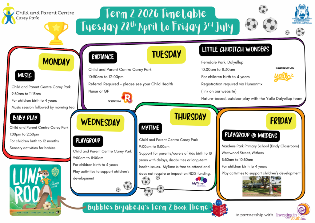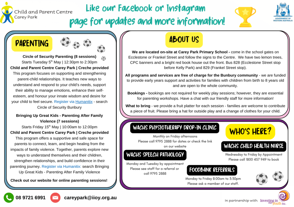Find out more by following the Centre on Instagram and/or Facebook, visit the Child and Parent Centre website page or contact us on 08 9721 6991.